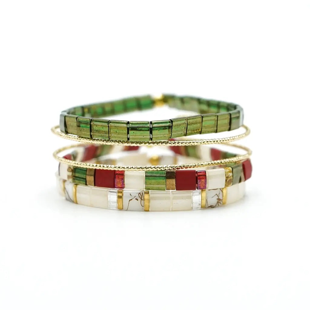 Our GETAWAY stack includes three total bracelets! (Yes, 3!!) Included in the stack are 3 tila bracelets with gorgeous colors of Light Blue, Dirty Teal, Pink, Orange, White and Gold.