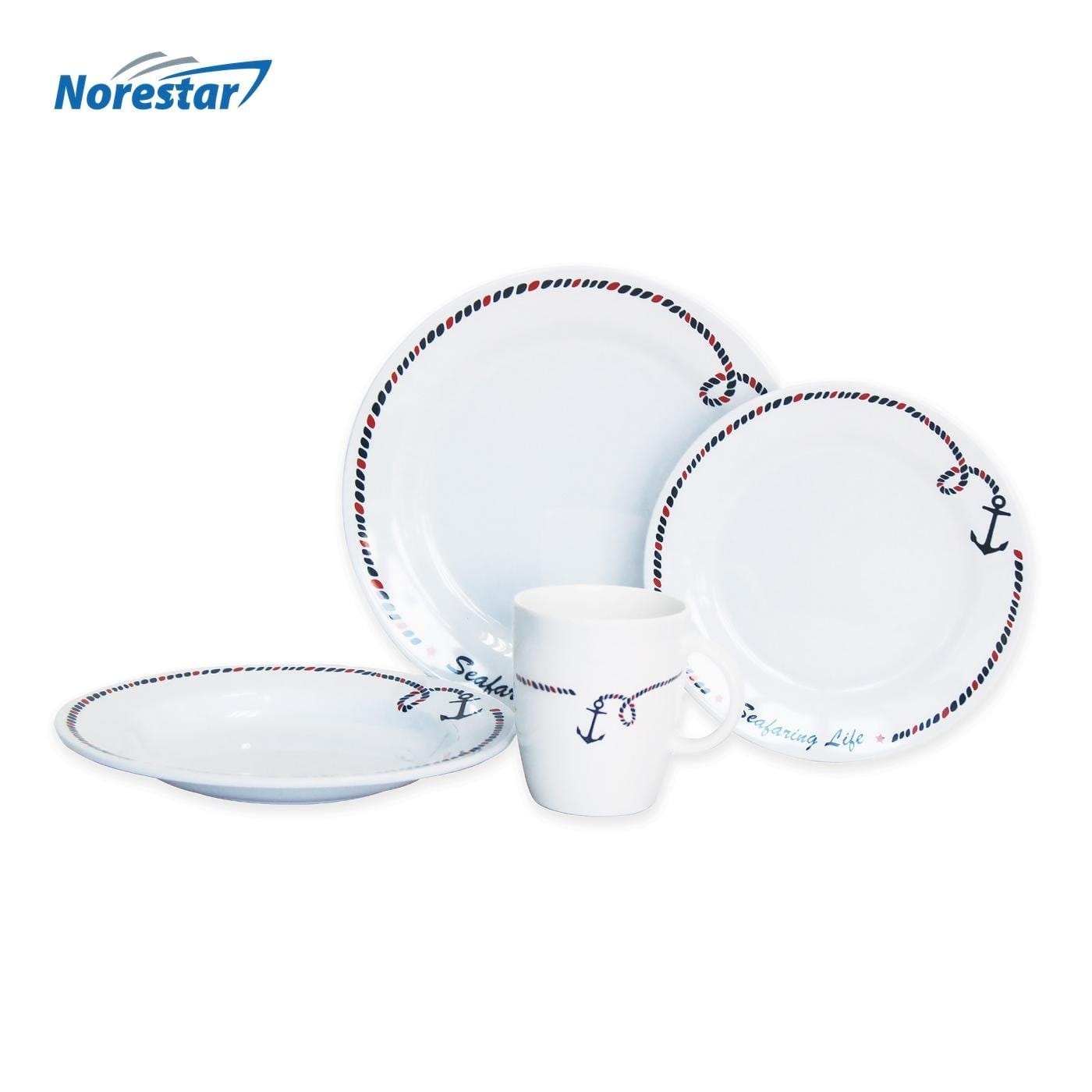 - Complete set of 16 nautical dishes includes (4) Mugs, (4) Plates, (4) Saucers, and (4) Bowls