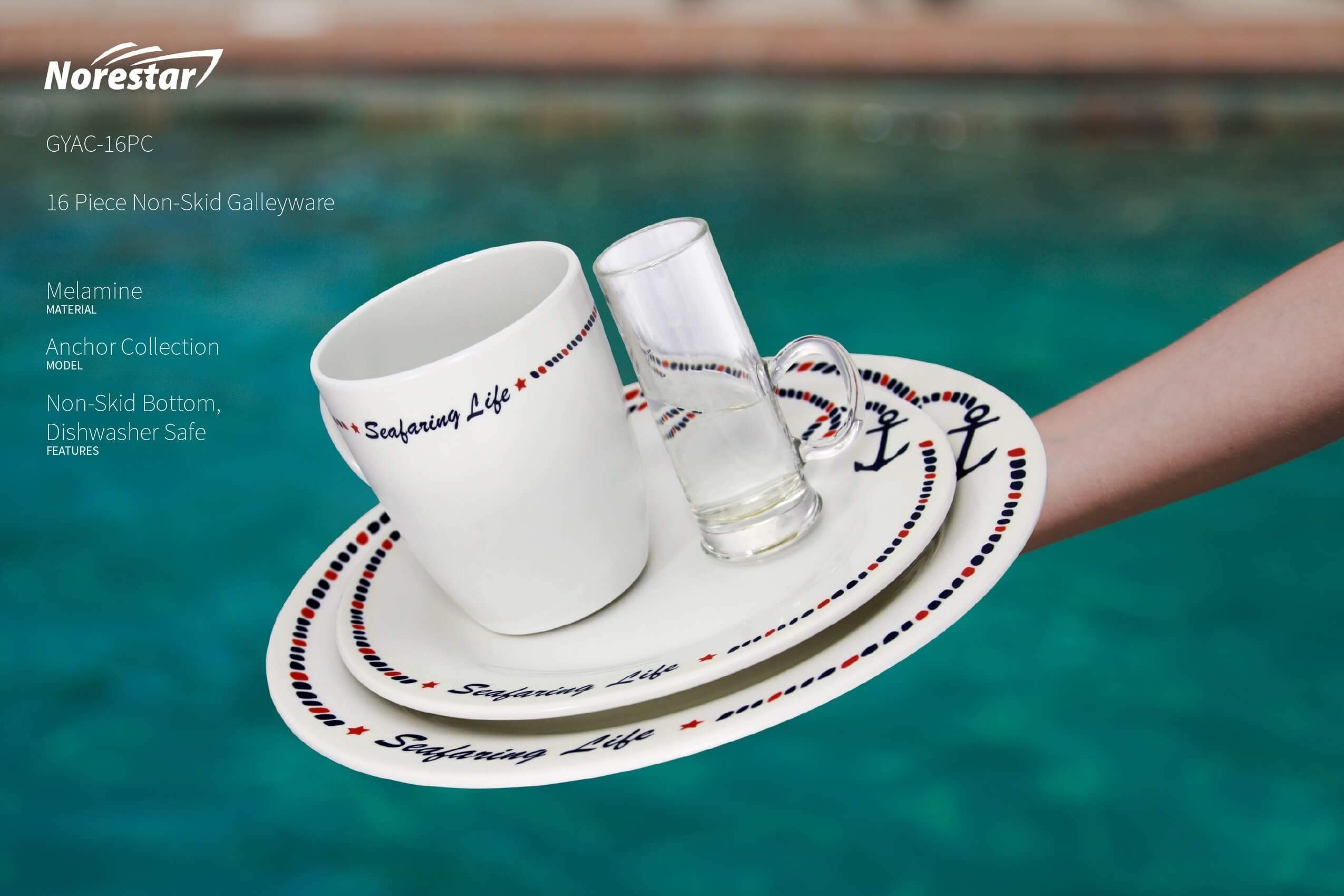This 16-piece set of Non-skid Melamine Galleyware adds a touch of nautical flare to your dining experience, while also accommodating the dynamic nature of the boating environment. The dishes feature a whimsical anchor design, sure to turn heads and draw favorable comments. The underside of the dishes are covered with skid-resistant rubber to keep them just where you want them, regardless of boat movement. Also, they are constructed of Melamine, a durable break-resistant material that is dishwasher safe yet maintains its attractive appearance.