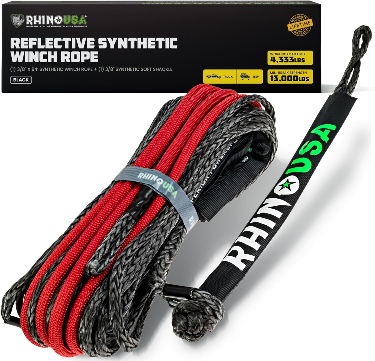 - HIGH QUALITY WINCH LINE- Elevate your off-road experience with our premium winch line, designed for optimal performance and durability. 3/8". x 94': 13,000lbs max break strength | 1/4" x 50': 5,000lbs max break strength.
