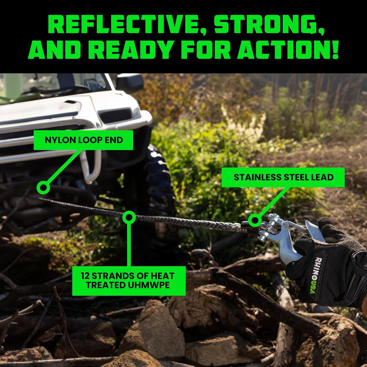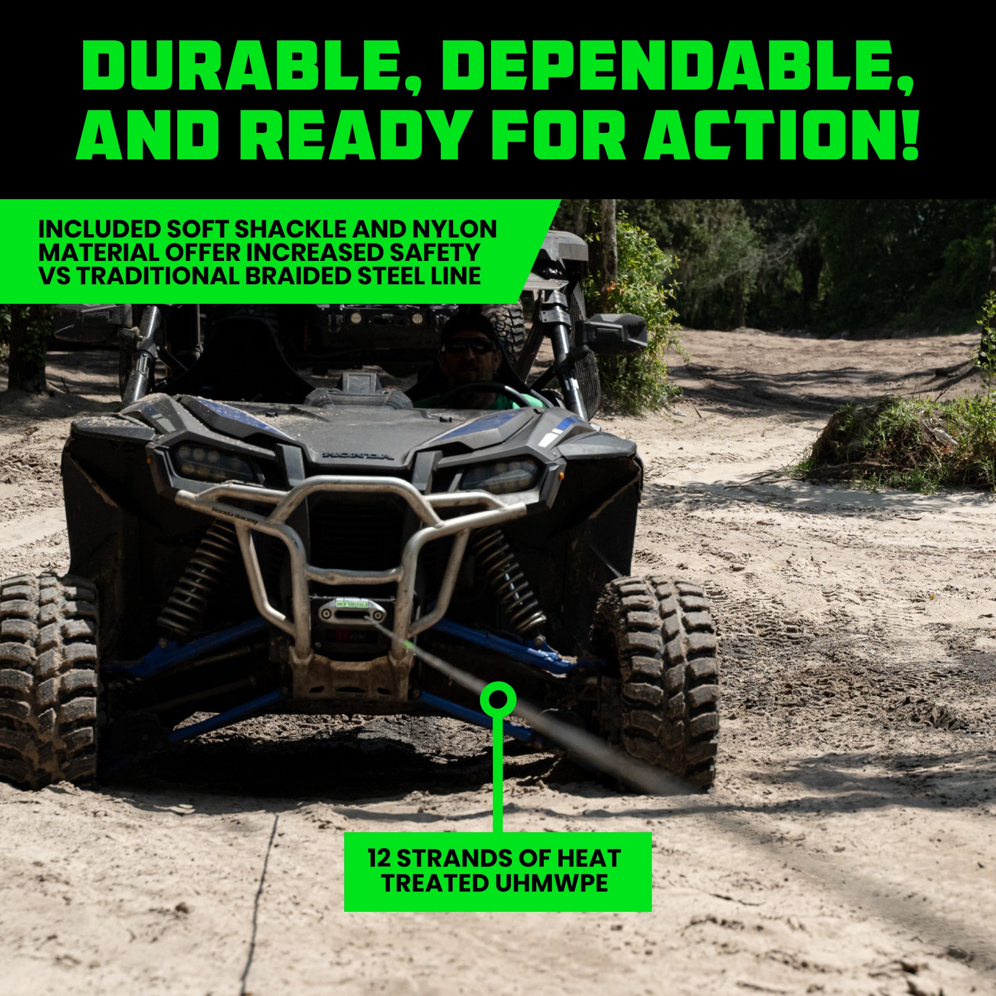 - BUILT FOR TOUGH OFF-ROAD CONDITIONS - High Strength UHWMPE fibers and integrated protective sleeve are designed for use on the roughest trails.
